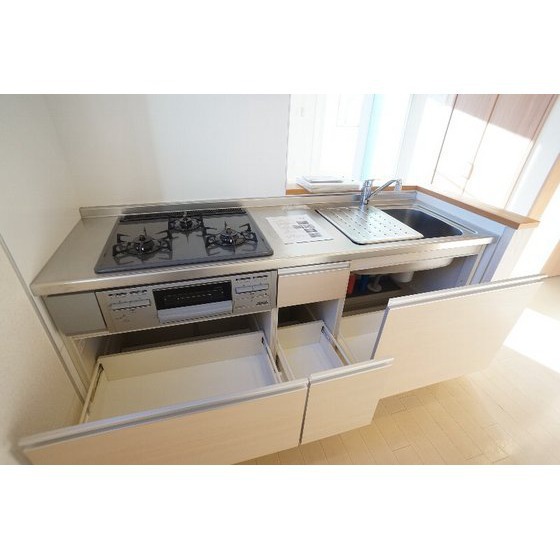 | 設備 | 室内洗濯機置場、追焚機能、シャワー、バス・トイレ別、トイレ、洗髪洗面化粧台、洗面台、温水洗浄便座、洗面所独立、カウンタキッチン、システムキッチン、ガスコンロ付、3口以上コンロ、収納スペース、ウォークインクローゼット、クローゼット、シューズボックス、給湯、プロパンガス、室内物干し、エアコン、エアコン2台以上、BS端子、モニタ付インターホン、防犯用ガラス、バルコニー、駐輪場 | ||||