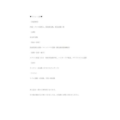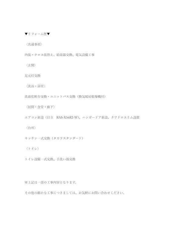 ▼リフォーム歴▼〈共通事項〉内装・クロス張替え、給湯器交換、電気設備工事〈玄関〉足元灯交換〈洗面・浴室〉洗面化粧台交換・ユニットバス交換(歓喜暖房乾燥機付)〈居間・食堂・廊下〉エアコン新設(日立 RAS-X56R2-W)、ハンガードア新設、クワドロスリム設置〈台所〉キッチン一式交換(タカラスタンダード)〈トイレ〉トイレ設備一式交換、手洗い器交換※上記は一部の工事内容となります。その他の細かな工事につきましては、お気軽にお問い合わせください。