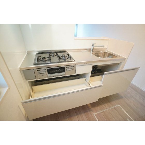 | 設備 | 室内洗濯機置場、追焚機能、シャワー、バス・トイレ別、トイレ、洗髪洗面化粧台、洗面台、温水洗浄便座、洗面所独立、浴室乾燥機、カウンタキッチン、システムキッチン、ガスコンロ付、3口以上コンロ、収納スペース、床下収納、クローゼット、シューズボックス、給湯、都市ガス、複層ガラス、フローリング、シャッター雨戸、室内物干し、エアコン、BS端子、オートロック、モニタ付インターホン、カードキー、モニタ付オートロック、防犯カメラ、バルコニー、宅配BOX、駐輪場 | ||||