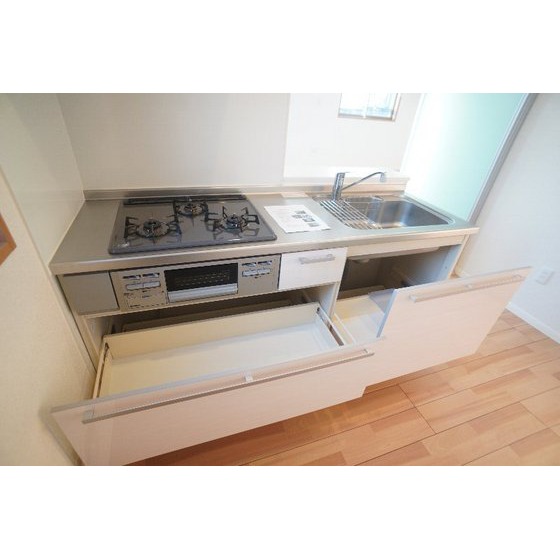 | 設備 | 室内洗濯機置場、追焚機能、シャワー、バス・トイレ別、トイレ、洗髪洗面化粧台、洗面台、温水洗浄便座、洗面所独立、カウンタキッチン、システムキッチン、ガスコンロ付、3口以上コンロ、収納スペース、ウォークインクローゼット、クローゼット、全居室収納、シューズボックス、照明器具、給湯、プロパンガス、複層ガラス、フローリング、シャッター雨戸、室内物干し、エアコン、エアコン2台以上、BS端子、モニタ付インターホン、防犯用ガラス、テラス、駐輪場 | ||||