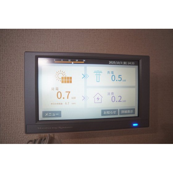 | 設備 | 室内洗濯機置場、追焚機能、シャワー、バス・トイレ別、トイレ、洗髪洗面化粧台、洗面台、温水洗浄便座、洗面所独立、浴室乾燥機、カウンタキッチン、システムキッチン、ガスコンロ付、3口以上コンロ、収納スペース、床下収納、クローゼット、シューズボックス、照明器具、給湯、都市ガス、フローリング、シャッター雨戸、室内物干し、太陽光発電システム、エアコン、エアコン2台以上、BS端子、オートロック、モニタ付インターホン、カードキー、防犯カメラ、バルコニー、宅配BOX、駐輪場 | ||||