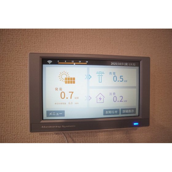 | 設備 | 室内洗濯機置場、シャワー、バス・トイレ別、トイレ、洗髪洗面化粧台、洗面台、温水洗浄便座、洗面所独立、浴室乾燥機、カウンタキッチン、システムキッチン、ガスコンロ付、3口以上コンロ、収納スペース、ウォークインクローゼット、クローゼット、シューズボックス、照明器具、給湯、都市ガス、フローリング、室内物干し、太陽光発電システム、エアコン、エアコン2台以上、BS端子、オートロック、モニタ付インターホン、カードキー、防犯カメラ、バルコニー、宅配BOX、駐輪場 | ||||
