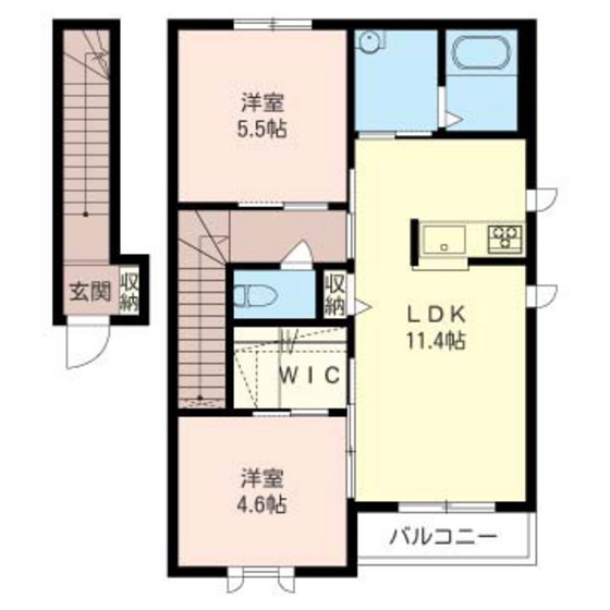 モン・リヴィエール 201 2LDK【55.20㎡】 LDK:11.4帖 洋室:5.5帖 洋室:4.6帖 |