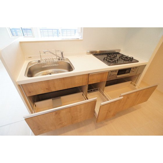 | 設備 | 室内洗濯機置場、追焚機能、シャワー、バス・トイレ別、トイレ、洗髪洗面化粧台、洗面台、温水洗浄便座、洗面所独立、浴室乾燥機、カウンタキッチン、システムキッチン、ガスコンロ付、3口以上コンロ、収納スペース、床下収納、ウォークインクローゼット、シューズボックス、給湯、プロパンガス、フローリング、室内物干し、エアコン、エアコン2台以上、全居室エアコン、BS端子、モニタ付インターホン、カードキー、防犯用ガラス、バルコニー、宅配BOX、駐輪場 | ||||